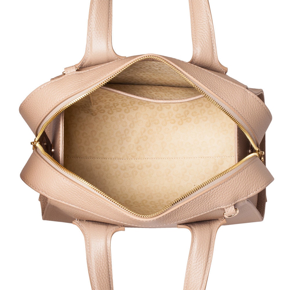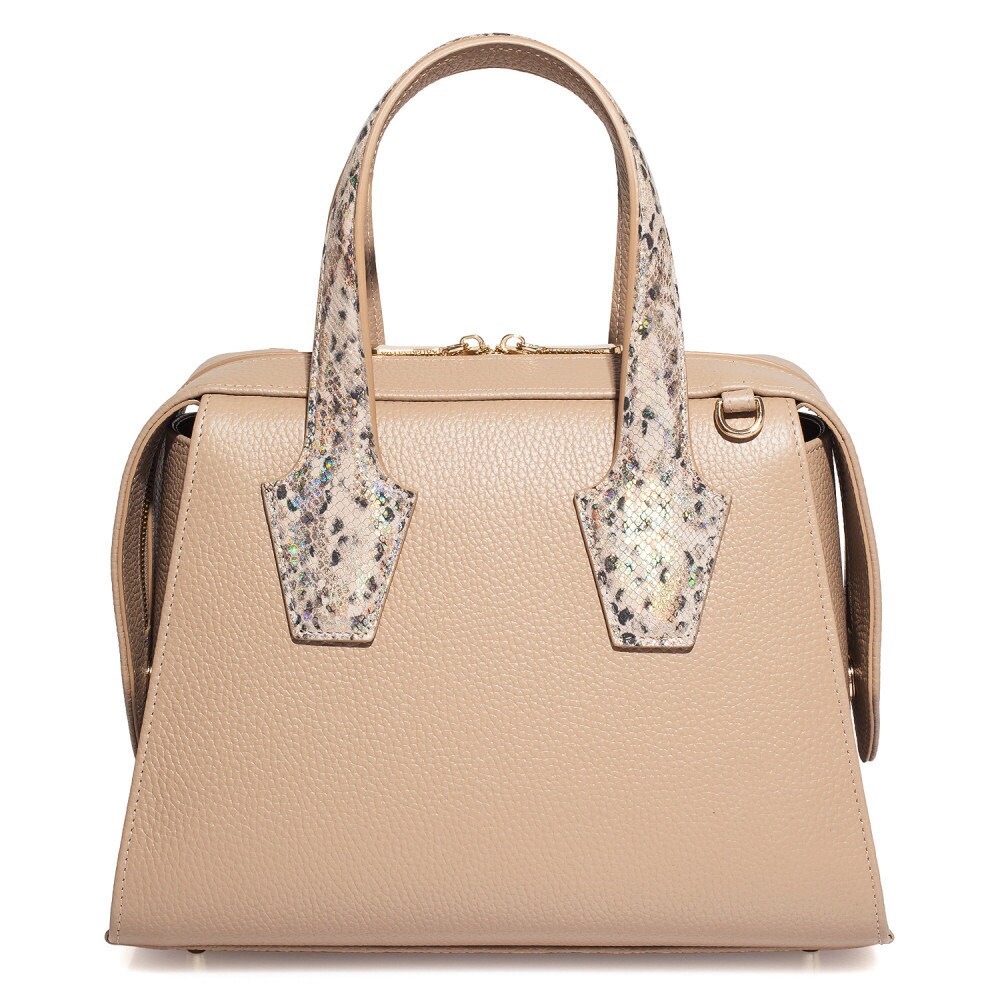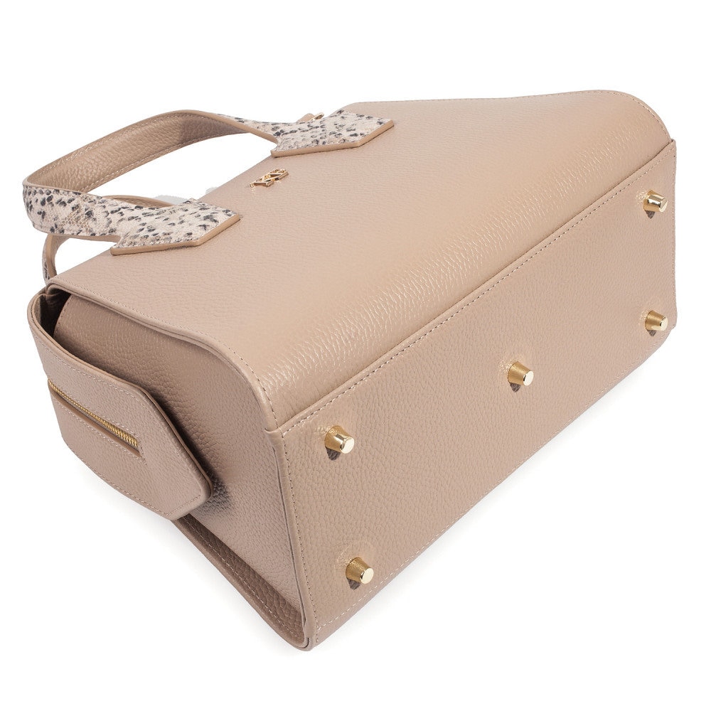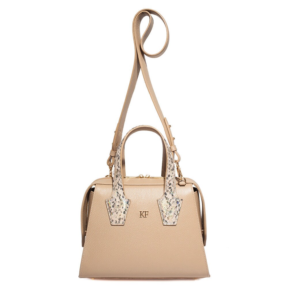 Beige genuine leather handbag from Ukrainian designer Katerina Fox. This model is designed for women who appreciate the sleek design combined with functionality and comfort. High-quality and reliable hardware ensure long service bags. The internal space of a bag is equipped with one spacious compartment and two pockets. The bag is closed with a zipper. The bottom of the bag is protected with metal legs. There is a long handle that allows you to wear the bag on the shoulder. The kit also includes a storage bag.